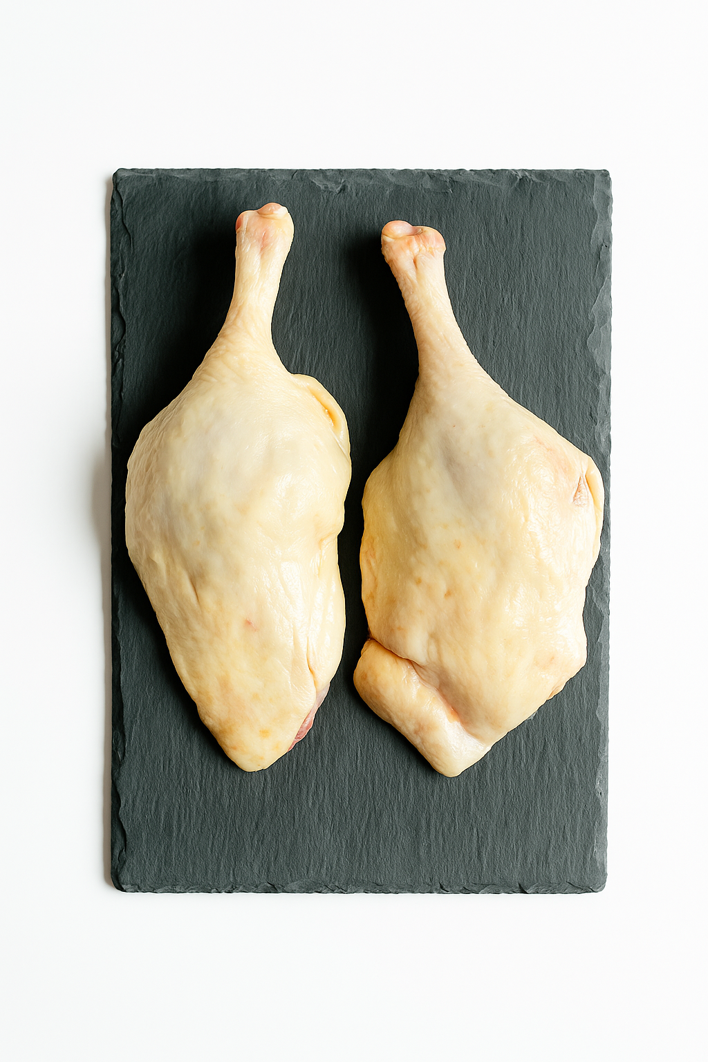 Nuestros muslos de pato frescos proceden de patos criados en semilibertad, seleccionados por su conformación cárnica y calidad grasa equilibrada. Cada pieza se presenta bien recortada y limpia, con piel íntegra y un nivel de infiltración natural que garantiza una cocción jugosa, aromática y llena de sabor.