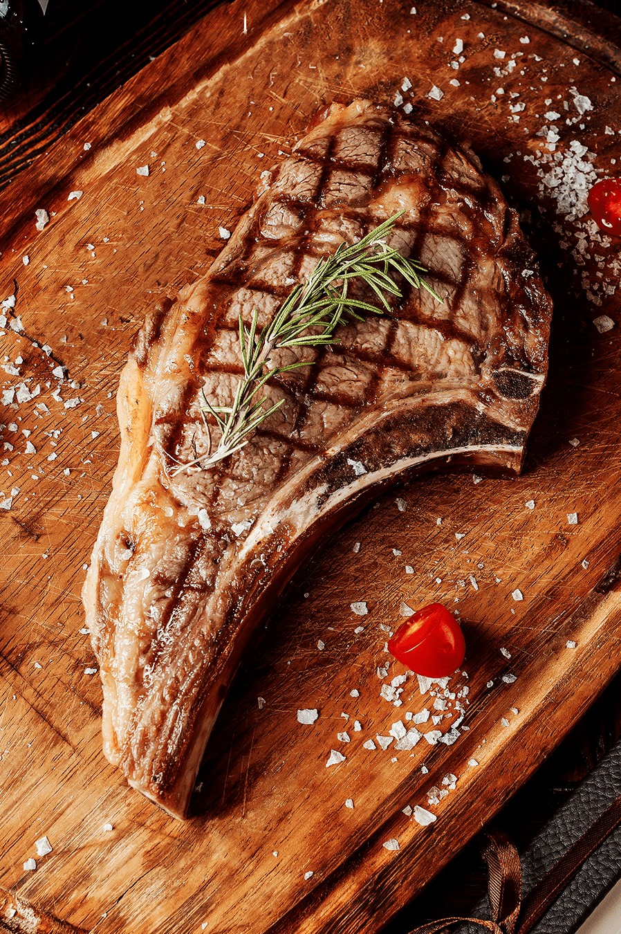 Chuletón de añojo a la brasa: sellado fuerte y reposado. Acompañar con escamas de sal y patata panadera.